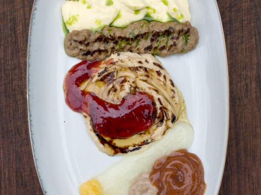 Andesteg med brune og hvide kartofler, skysauce, rødkål, æbler med ribsgelé og agurkesalat (cremet)