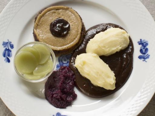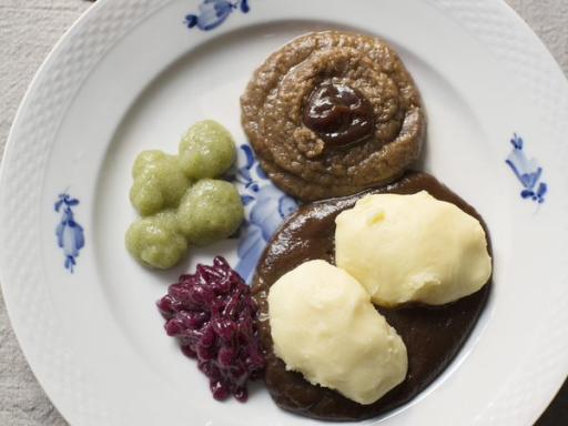 Rullesteg med kartofler, skysovs, rødkål og agurkesalat (cremet)