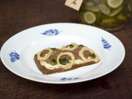 Frikadelle med bløde stegte løg, pebermayonnaise og drueagurk (gratin)
